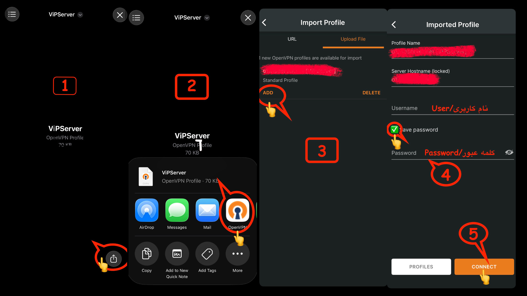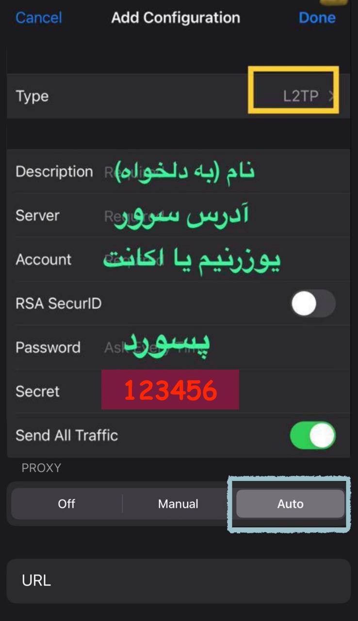 سپس مطابق عکس، اطلاعات اکانت دریافتی را وارد نموده و از بالا سمت راست گزینه Done را زده